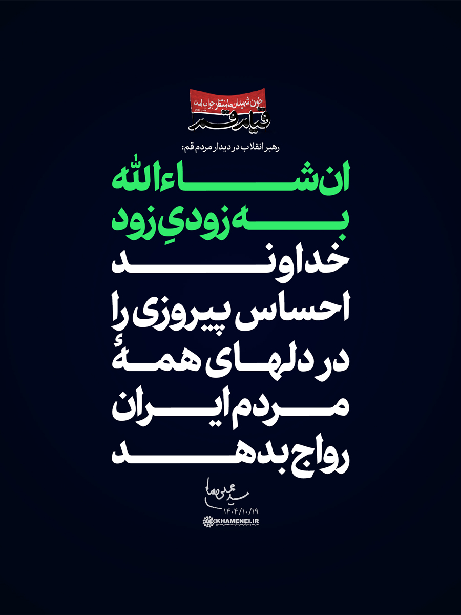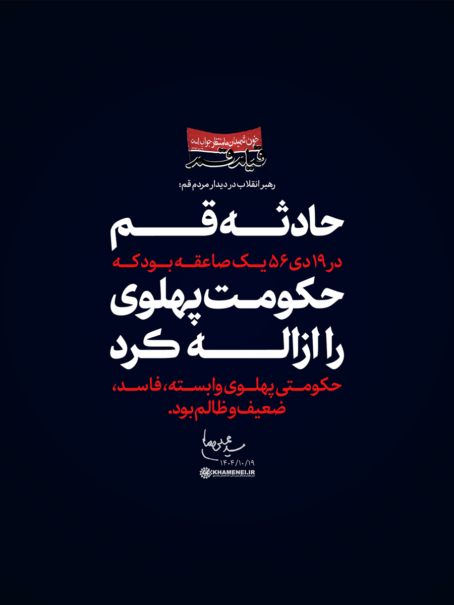 به مناسبت سالگرد قیام ۱۹ دی قم در سال ۱۳۵۶ در حمایت از حضرت امام خمینی(ره) علیه رژیم پهلوی، هزاران نفر از اقشار مختلف مردم این شهر، صبح امروز (جمعه) با حضور در حسینیه امام خمینی تهران، با رهبر انقلاب اسلامی دیدار کردند.
