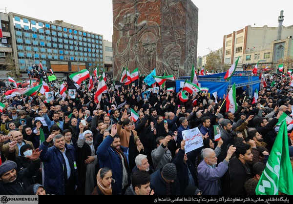 حضرت آیتالله خامنهای رهبر انقلاب اسلامی در پیامی ضمن تجلیل از کار بزرگ ملّت عظیمالشأن ایران در اجتماعات گسترده امروز و روز تاریخیای که آفریده شد، تأکید کردند: ملّت ایران، خود را و همّت و هویت خود را به رخ دشمنان کشید و این هشداری به سیاستمداران آمریکا بود که فریبکاری خود را متوقف کنند و به مزدوران خائن تکیه نکنند. رسانه KHAMENEI.IR به همین مناسبت، گوشههایی از اجتماع ملت ایران در پاسخ به اغتشاشات دیماه ۱۴۰۴ را منتشر میکند.