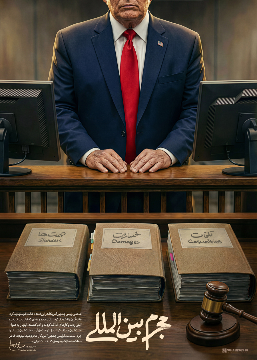 مجرم بینالمللی حضرت آیتالله خامنهای: شخص رئیسجمهور آمریکا، در این فتنه دخالت کرد، تهدید کرد، فتنهگران را تشویق کرد... این مجموعهای که تخریب کردند و آتش زدند و کارهای خلاف کردند و آدم کشتند، اینها را به عنوان ملّت ایران معرّفی کرد؛ یعنی تهمت بزرگی به ملّت ایران زد؛... اینها جرم است... ما رئیسجمهور آمریکا را مجرم میدانیم؛ به خاطر تلفات، خسارات و تهمتی که به ملّت ایران زد.» ۱۴۰۴/۱۰/۲۷رسانه KHAMENEI.IR براساس این بخش از بیانات رهبر انقلاب، لوح «مجرم بینالمللی» را منتشر میکند.