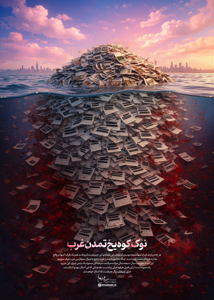 نوک کوه یخ تمدن غرب حضرت آیتالله خامنهای: «هر چه دربارهی فساد اینها شنیده بودیم یک طرف، این قضیّهی این جزیرهی بدنام و فاسد هم یک طرف! اینها در واقع نشاندهندهی تمدّن غرب است. اینکه ما راجع به تمدّن غرب، راجع به لیبرالدموکراسی غرب حرف میزنیم، این است. دویست سال، سیصد سال حرکت میکنند، نتیجهاش میشود یک چنین چیزی. این جزیره یک نمونه است؛ از این قبیل حرفها خیلی زیاد است. همچنانی که این آشکار نبود و آشکار شد، خیلی چیزهای دیگر هم هست که آشکار خواهد شد.» ۱۴۰۴/۱۱/۲۸رسانه KHAMENEI.IR براساس این بخش از بیانات رهبر انقلاب، لوح «نوک کوه یخ تمدن غرب» را منتشر میکند.